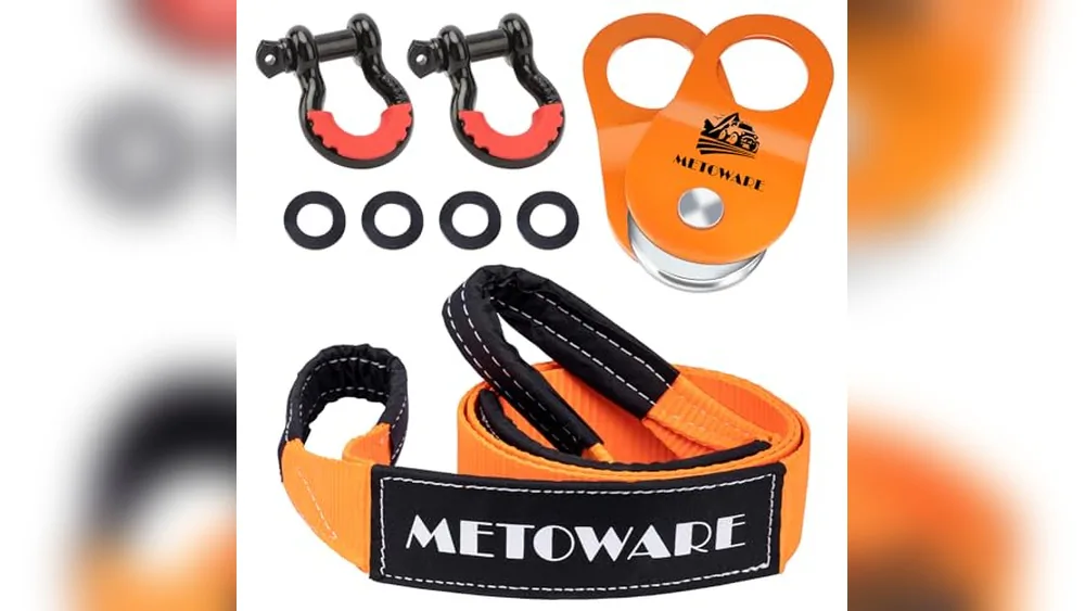 The METOWARE Offroad Recovery Snatch Block Kit is a comprehensive towing winch snatch block set that includes a 10-ton heavy-duty snatch block, an 8-foot tree saver strap, and two 3/4″ D ring shackles. This kit solves the common problem of safely and effectively recovering vehicles stuck in off-road conditions by distributing load and protecting recovery points.