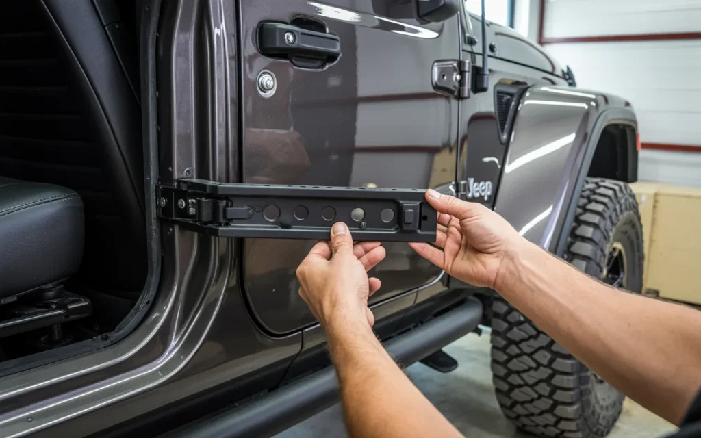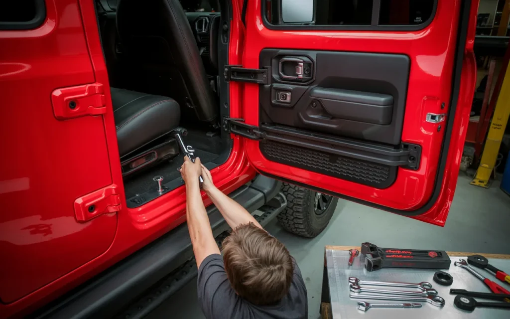 Safety comes first here. Make sure the Jeep is in park with the emergency brake engaged. If you’re working alone, use door stops to prevent accidental closing. Taking these precautions avoids mishaps and lets you focus on the task. Once prepped, you’re ready to move forward with the actual installation, knowing your base is clean and secure.