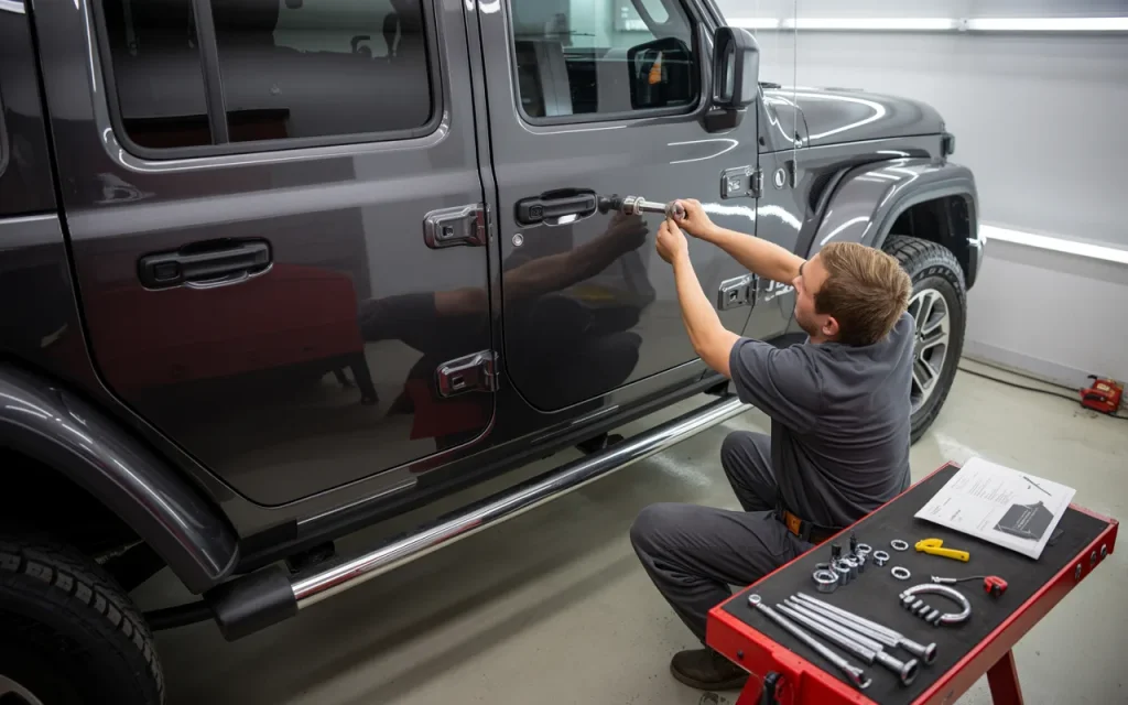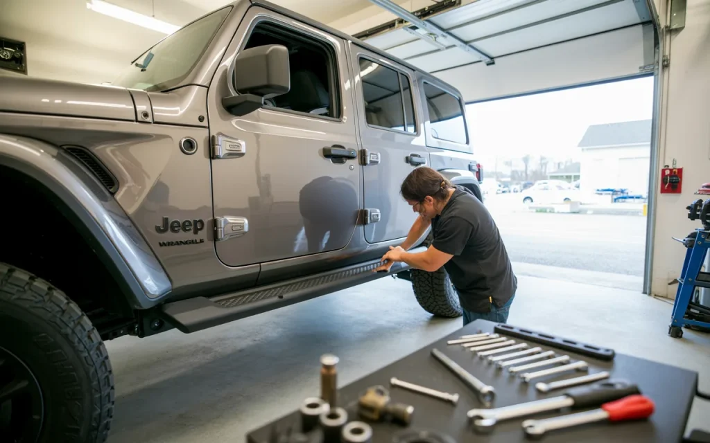 If installing on a two-door JL, note fewer brackets—usually two per side instead of three. Power steps add wiring: connect to the door sensors and battery, routing cables carefully to avoid pinching.