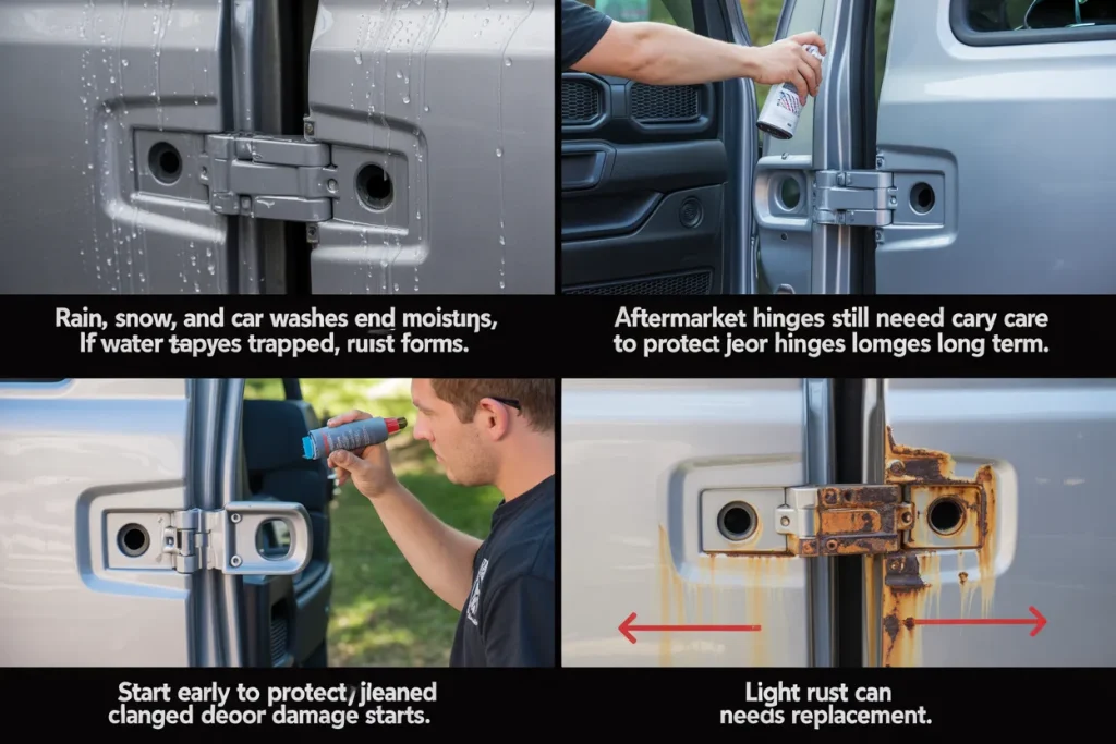 Rain, snow, and car washes push moisture into hinge gaps. If water stays trapped, rust forms.