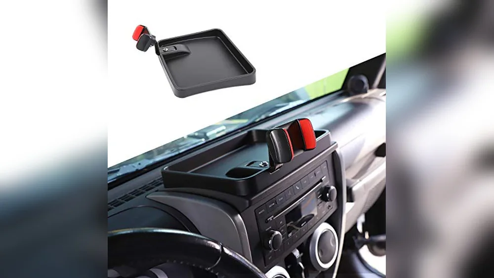 This dash organizer is made specifically for Jeep Wrangler JK models from 2007 to 2010. It helps solve the common problem of clutter on the center console by providing a sturdy tray and a rotatable phone holder. The full 360-degree rotation on the phone mount is a practical feature that lets you adjust your phone’s position with ease while driving.