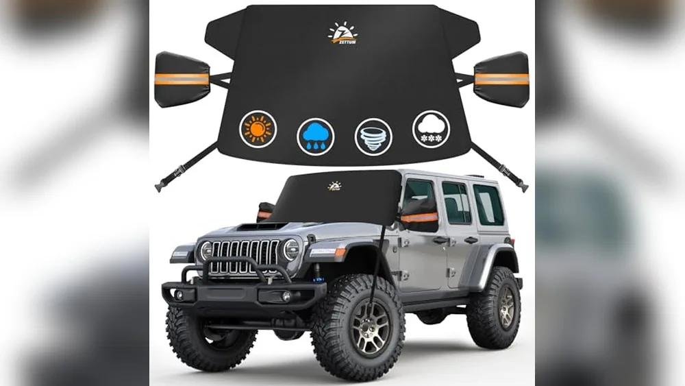 The Zettum Snow Shield is a heavy-duty windshield cover designed to keep your Jeep Wrangler’s front window free from snow, ice, and frost. Made from durable 600D oxford cloth with a waterproof PU coating, it offers solid protection against winter weather and other outdoor debris. Its size fits Jeep Wrangler and similar models snugly, helping prevent time-consuming snow removal in the cold.
