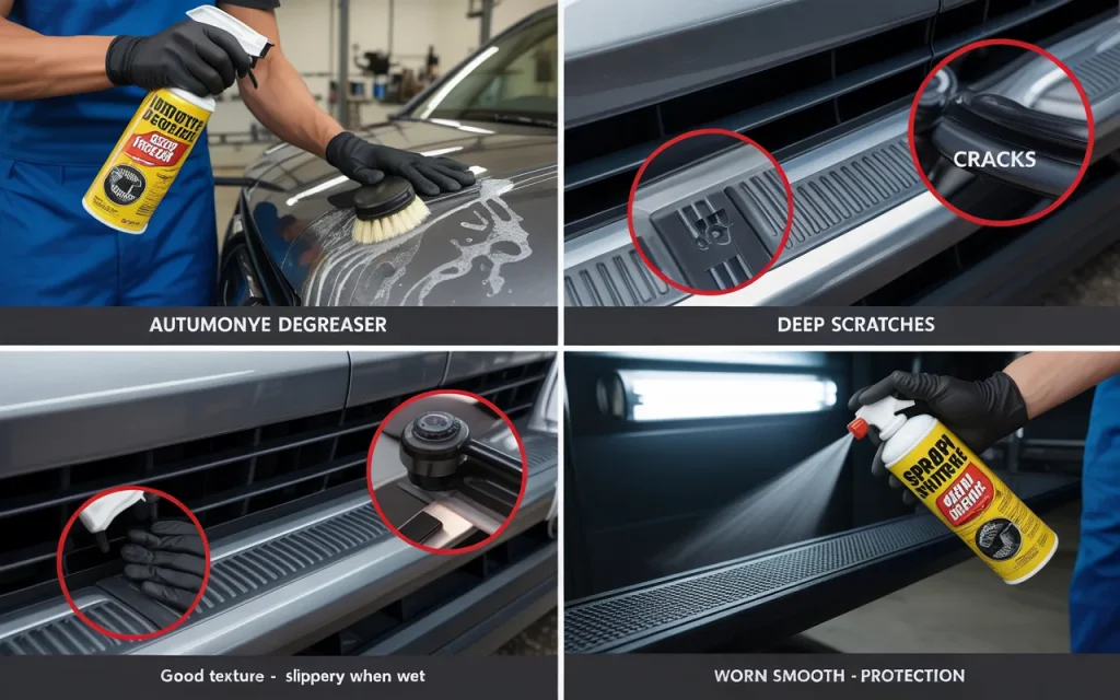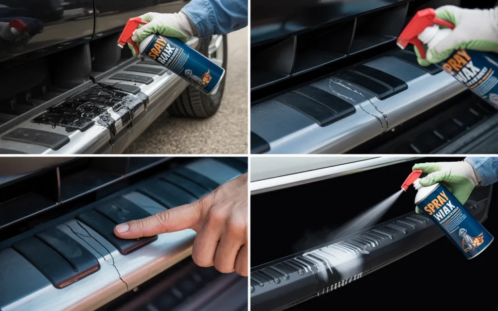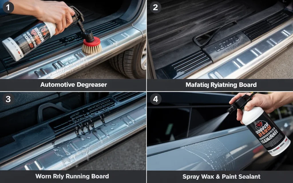 For Plastic or Rubber Running Boards: Use a UV-resistant rubber protectant. Spray it on a microfiber cloth first. Then, wipe it evenly over the surface. This keeps the material from fading in the sun and stops it from drying out and cracking. It often gives a nice dark, like-new finish.