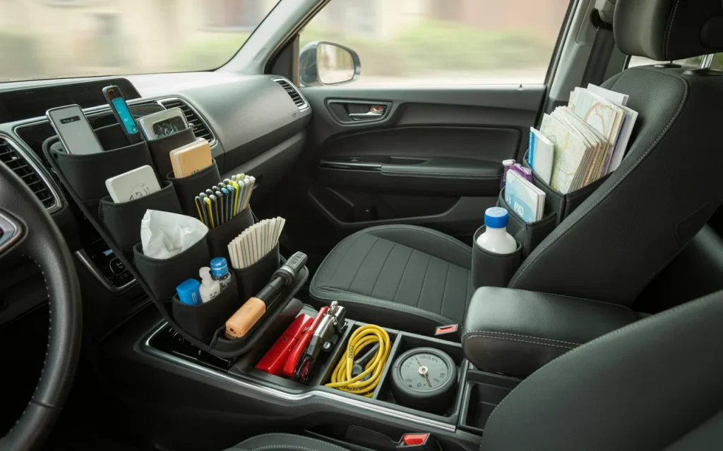 Before diving into specific areas, gather some basic items to make the process easier. You don’t need fancy gadgets; everyday household things often work fine. Start with storage bins in various sizes – think small ones for the console and larger for the trunk. Mesh pockets that attach to seat backs are great for holding maps or snacks. Cable organizers keep chargers from tangling, and trash bags with hooks prevent litter from scattering.